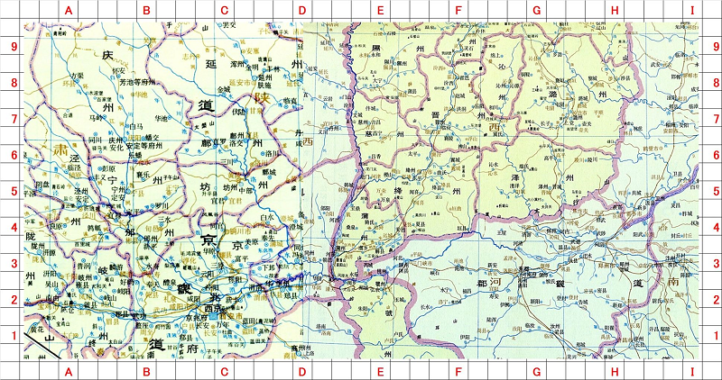 6. ・東西千嶂亂 東西に黄河が流れ(地図では2-5)その両側に延々と山が連なる。東西に連なる山は中条山脈(E-4)である景山、王屋山、折城山、烏牢山と太行山脈(G-5)に連なっている。その山を割って絃水(丹水)が潞州、晋州を経て南北に流れ出て黄河に灌ぐのである。